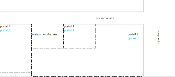 C’est le 09 avril au matin, nous bénéficions d’un permis pour vivre provisoire, nous sommes installés chez notre voisin congolais, il n’y a pas que ma famille qui vit sous sa protection. A n’importe quel moment les Interahamwe pouvaient passer pour nous éliminer… Profitant d’un moment d’accalmie nos voisins nous ont raconté ce qui s’était passé le 07 et le 08 avril. Le 07 avril 1994 en début d’après-midi, notre voisin V. celui qui était dans le MRND a appelé les militaires de l’armée rwandaise pour qu’ils viennent tuer les gens du quartier, il avait une liste. Le premier sur la liste, celui qu’ils considéraient le plus dangereux, était notre voisin J. (Cf la deuxième partie pour en savoir plus sur les deux voisins). Dans son appel notre voisin V. avait indiqué aux militaires où se trouvait la maison de J. : Le deuxième Igipangu (une maison clôturée) sur la rue. Dans le dessin ci-dessous, il utilisait la logique en noir. Or quand les militaires sont arrivés, ils ont compté les maisons en suivant une autre logique, celle en bleu et se sont donc trompés de maison. Dans la logique des militaires la deuxième maison cloturée était celle de M V.