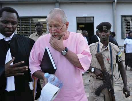 En haut à droite : Le professeur de droit américain Peter Erlinder en uniforme de prisonnier au Rwanda alors qu’il se battait pour sa propre cause en 2010.