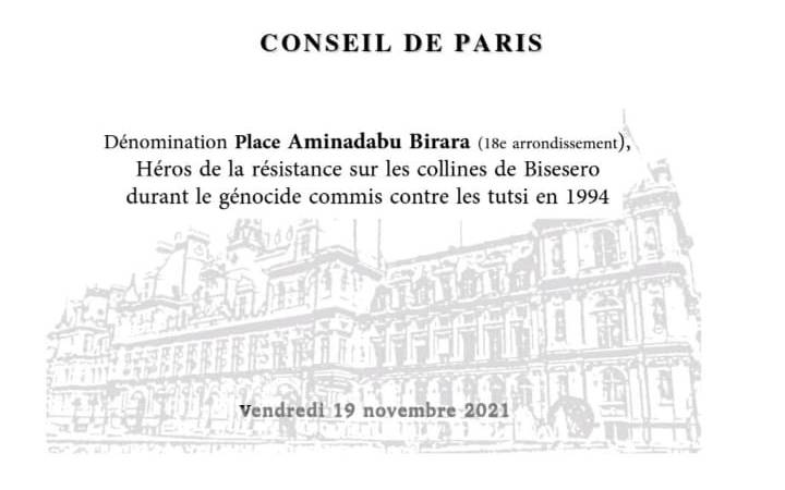 Ce vendredi 19 Novembre 2021, le conseil de Paris a approuvé la dénomination d’une place située dans le 18ème arrondissement de la capitale au nom d’Aminadabu Birara. C’est sous son leadership que la résistance à Bisesero contre les civils, les militaires et les Interahamwe s’est organisée.