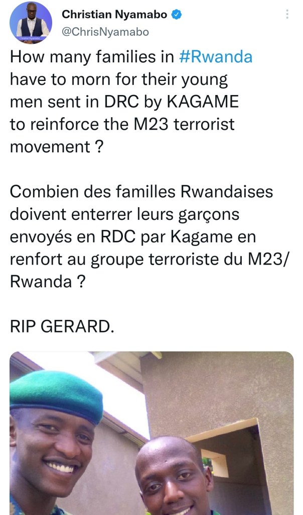 Parfois les familles publient les photos de leurs enfants sur les réseaux sociaux et les suppriment par crainte de représailles. Christian Nyamabo s’interrogeait sur Twitter sur le nombre des familles qui allaient perdre leurs enfants envoyés par Kagame en renfort au groupe terroriste M23/Rwanda ? Il évoquait la mort d’un Gerard.