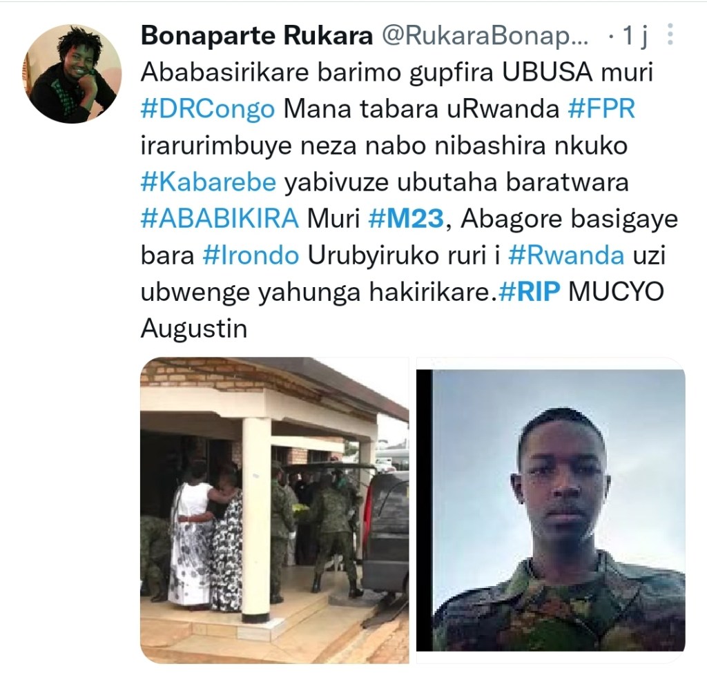 Bonaparte Rukara, un compte anonyme, souhaitait un repos éternel à Augustin Mucyo, qui lui aussi a perdu sa vie sur le front en RDC, il conseillait aux jeunes hommes rwandais de fuir le Rwanda pour éviter d’aller servir de chair à canon dans l’est de la RDC.